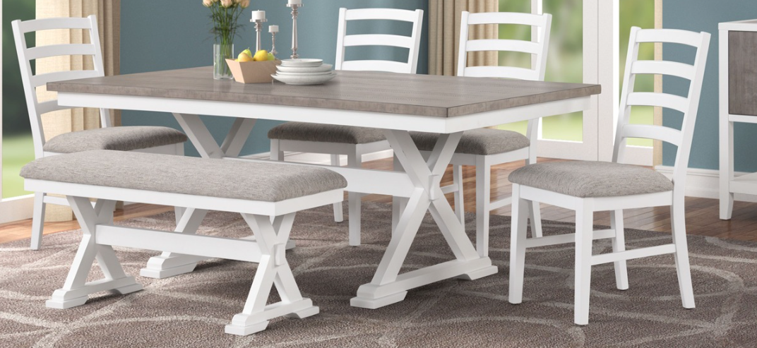 Brookside white dining with white base features a sleek gray tabletop. This design creates a modern contrast, blending understated elegance with a fresh, contemporary look. Ideal for various dining settings, it provides a stylish and versatile centerpiece for your dining area. With Upholstered Ladder-Back Chairs and Double Pedestal Bench.Read More
