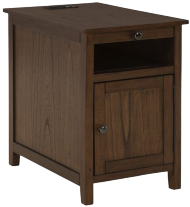 This end table displays accent pieces and stores essentials securely while keeping devices powered up