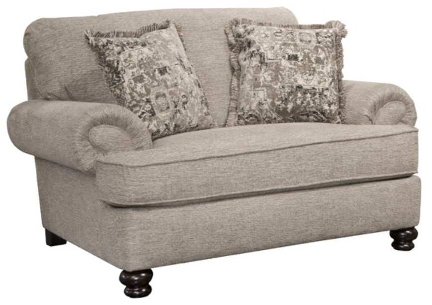 Features soft Chenille Fabric, rolled arm traditional design, correlating throw pillows with fringe, wooden legs with walnut finish, and comfort coil seating featuring Comfort-Gel.